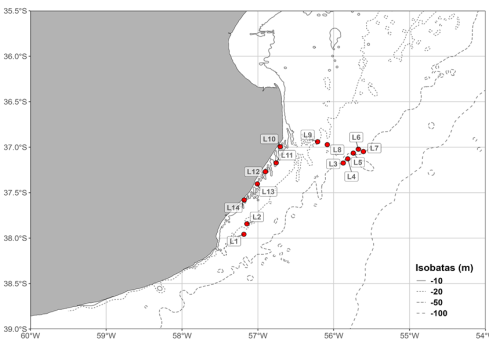 El área de estudio abarcó desde los 37,9°S hasta los 36,9°S, a profundidades entre 9 y 53 m. En total se efectuaron 12 operaciones de pesca con red de arrastre de fondo de corta duración, a fin de optimizar la supervivencia de los ejemplares capturados. Se realizó también un lance de pesca utilizando un palangre de fondo con 200 anzuelos, diseñado para la captura de peces asociados al fondo marino, a fin de capturar y marcar ejemplares de gatuzo y otros peces cartilaginosos.